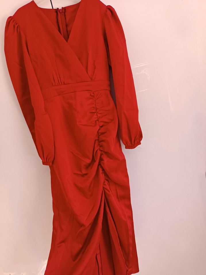 Drapeli, V yaka ve uzun kollu kırmızı uzun elbise, ince ve parlak kumaştan. Minimalist ve çağdaş tarzda, romantik gece için uygun. ❤️43 kiloya kadar olur
