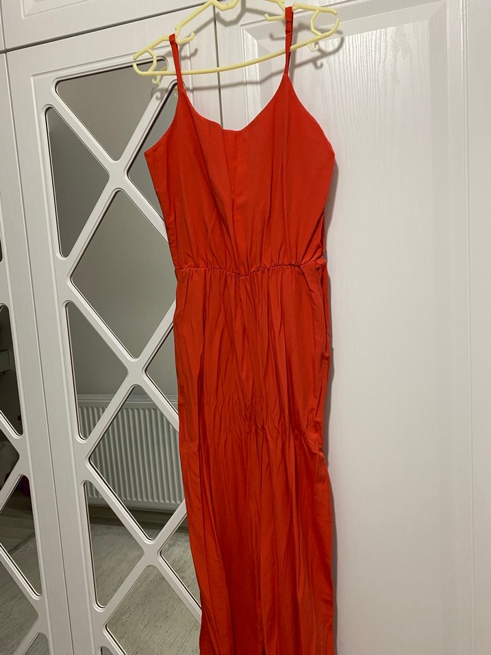 V yaka ve kolsuz kesime sahip, drapeli ve kırmızı parlak sentetik kumaştan uzun, vücuda oturan relax tulum kumaşı çok rahattır terletmez m l bedenler içim uygundur