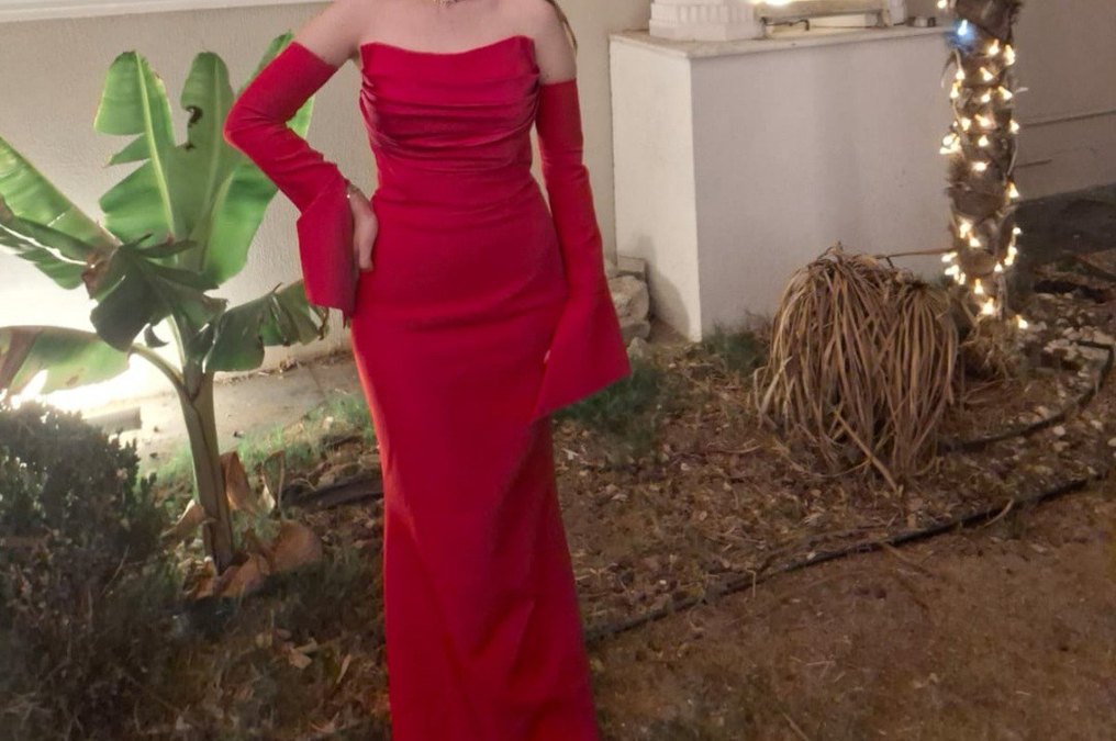 Kırmızı, straplez yaka ve uzun drapeli kollara sahip, klasik ve avangard tarzda uzun, vücudu saran elbise. kol detayları çıkıyor 36 38 beden uyumlu 167 56 kg gorseldeki gibi duruyor