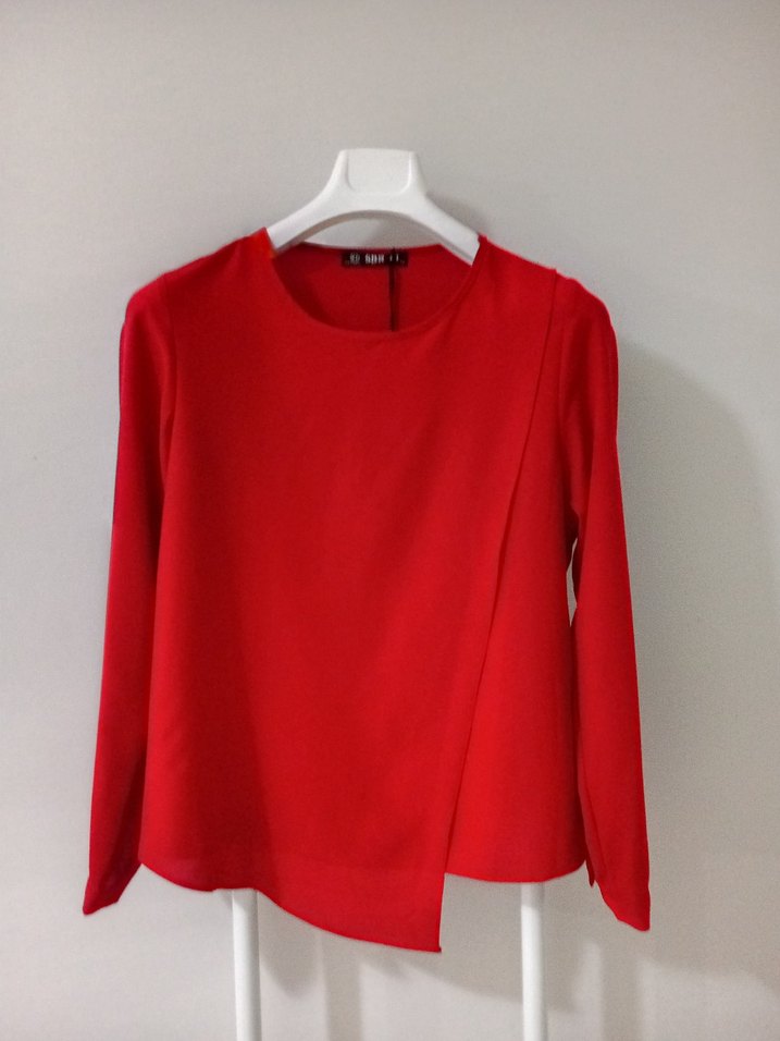 Kırmızı renkte, uzun kollu ve yuvarlak yakalı, ipeksi dokulu, bol kesim ve drapeli detaylı kısa uzunlukta minimalist ve çağdaş tarzda bluz.