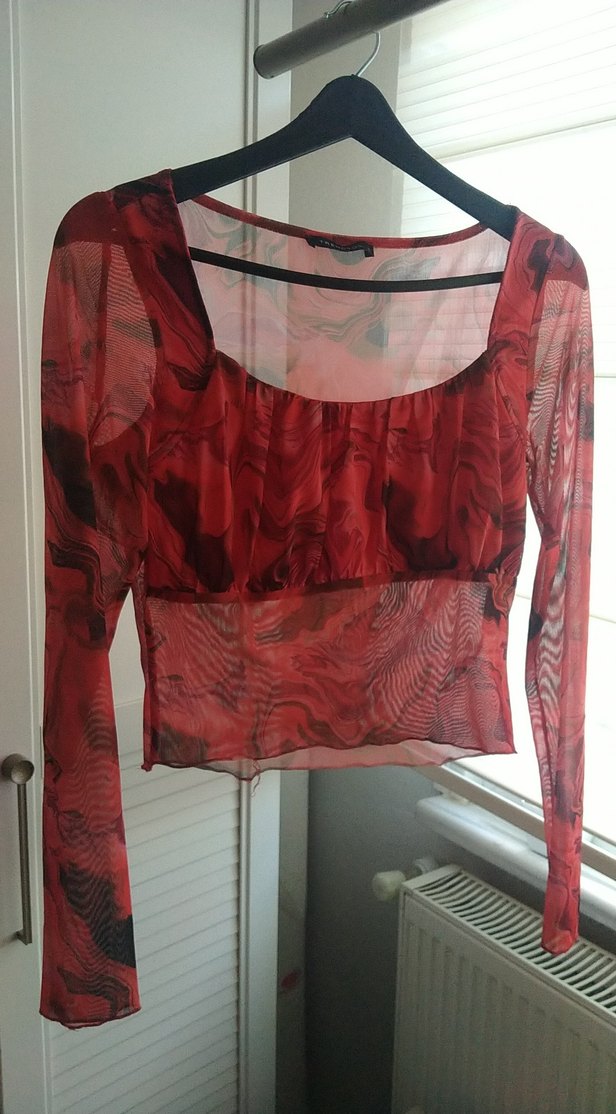 Drapeli tasarıma sahip, uzun kollu ve kayık yaka kırmızı bluz. Koyu kırmızı ve batik desenli, midi boyda, romantik akşamlar için uygun.