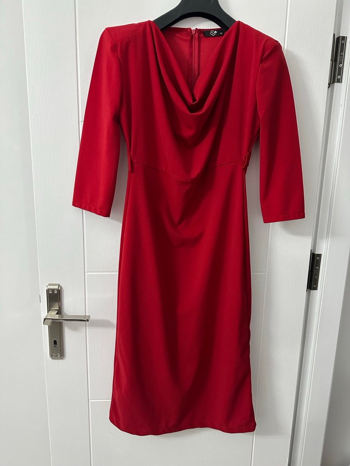 Drapeli V yaka, uzun kollu ve fitted kesim kırmızı kadın elbise. Modern klasik tarzda, desen içermeyen uzun ve renkli şık tasarım.