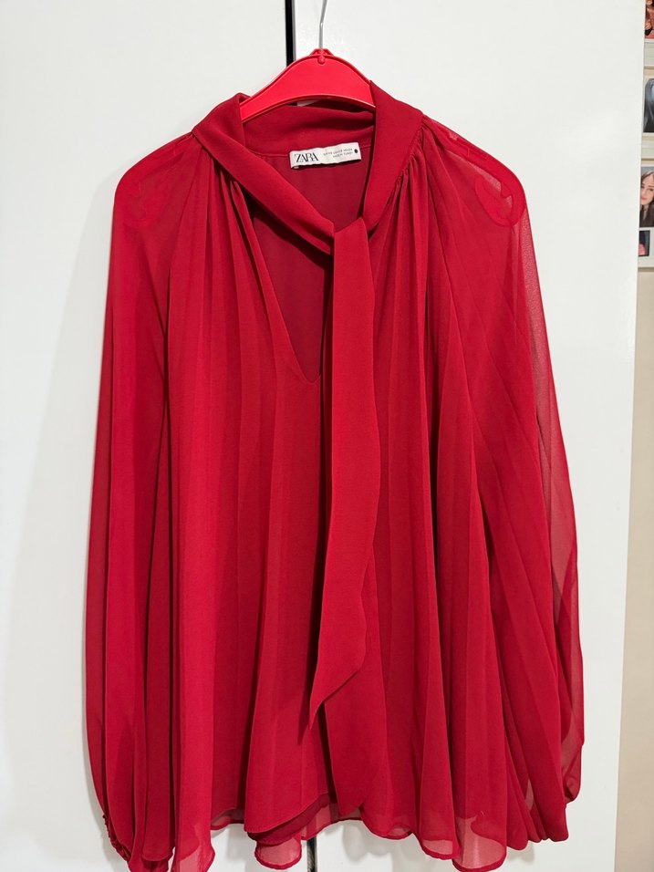 Kırmızı, drapeli, uzun kollu, bol kesim kadın gömlek. İpeksi dokulu, halter yakalı ve uzun boylu, minimalist ofis stiline uygun.