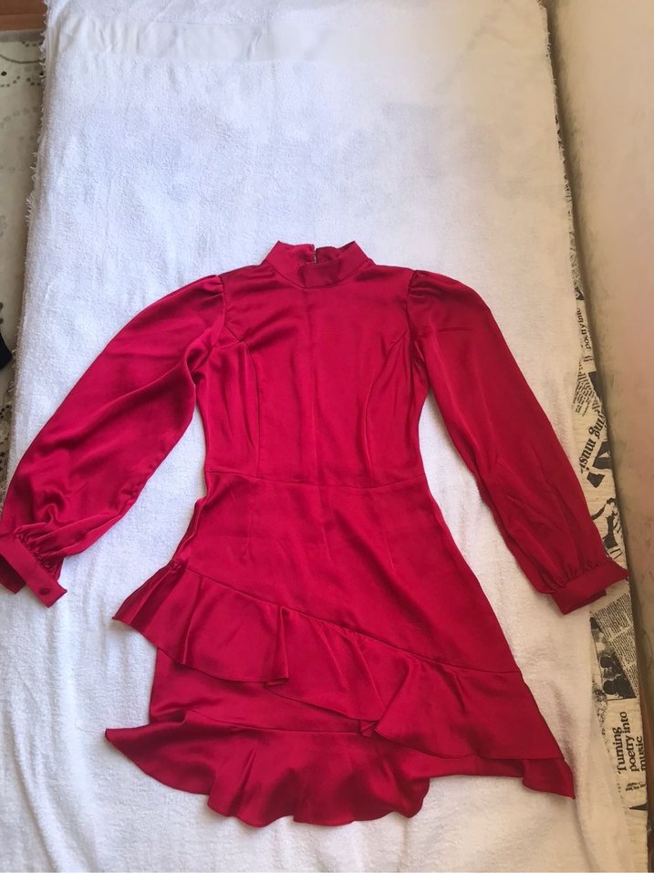 Drapeli detaylı, parlak kırmızı midi elbis, uzun kollu ve yüksek yakalıdır, romantik akşamlar için uygundur. ✨1 kere giyilmistir tekliflerinize açığım