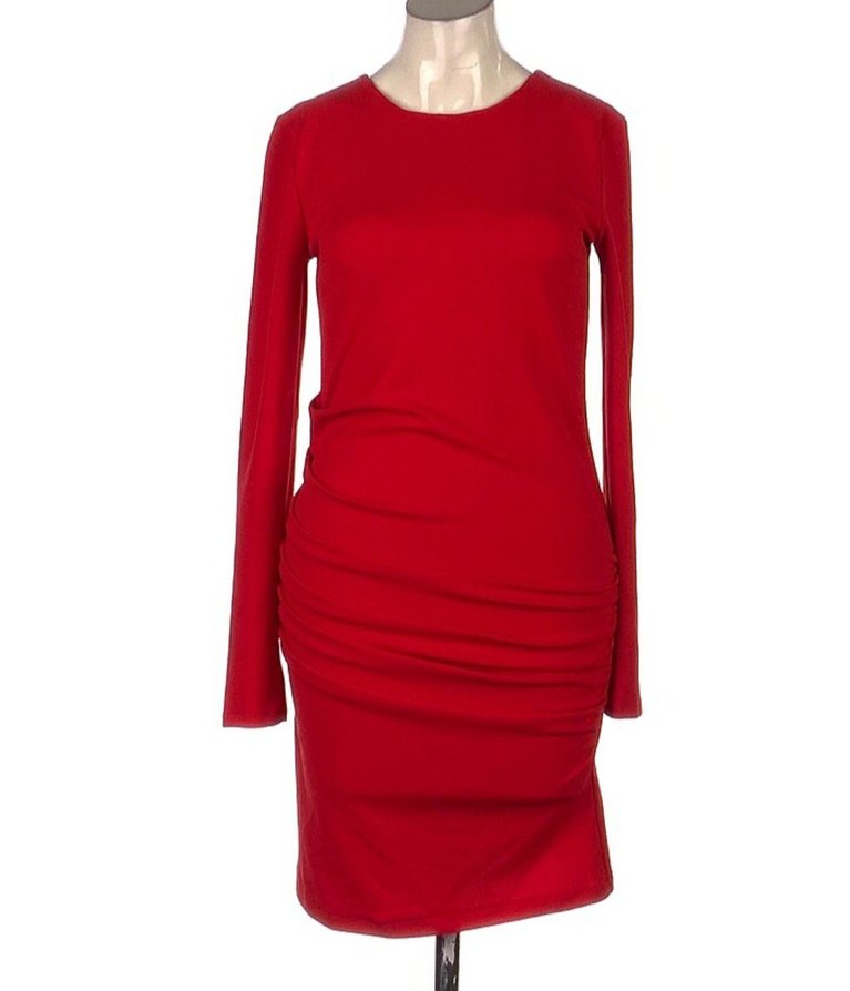 Drapeli detaylı, uzun kollu kırmızı triko elbise. Orta boy, vücuda oturan kesim ve sade, cesur tarz sunar. Rahat ve sıcak dokulu kumaş.