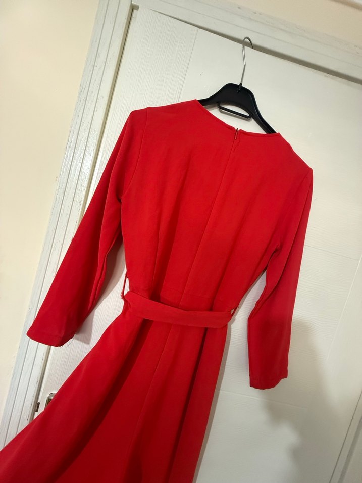 Kırmızı renkte, drapeli tasarıma sahip uzun kollu ve V yakalı uzun tulum elbise. Rahat kesimi ve sentetik kumaşıyla romantik akşamlar için uygun. ❤️