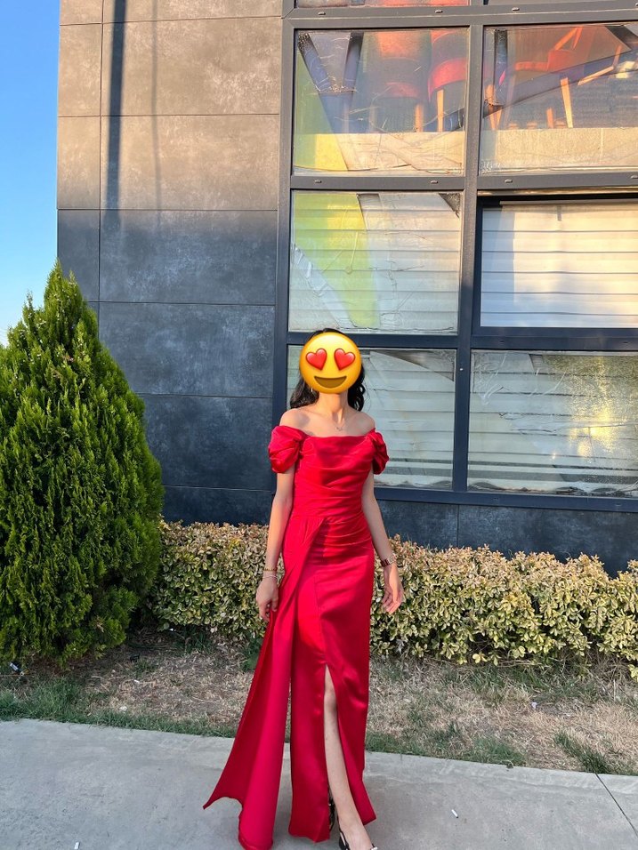 Drapeli detaylara ve ince askılı kollara sahip, kırmızı uzun ve vücuda oturan abiye. Straplez yakası ve parlak kumaşı ile dikkat çeker. ❤️