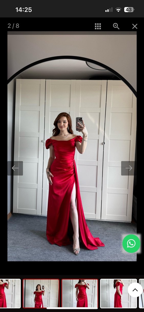 mezuniyet günü 1 kere tek giyindim Cesur, kırmızı drapeli uzun elbise, straplez yaka ve ince askılarla. Yüksek yırtmaçlı, avant-garde sokak tarzı ve düğünler için uygun. 1 kere tek giyildi yep yeni