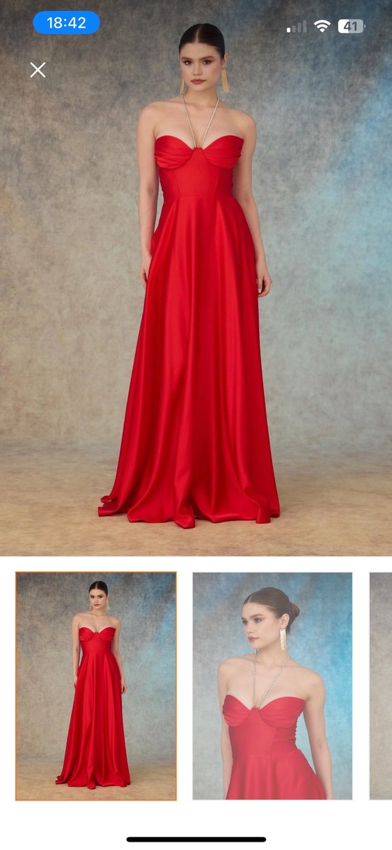 Kırmızı, straplez ve drapeli tasarıma sahip uzun abiye elbise. Parlak dokusu, kolsuz ve regular fit kesimiyle modern klasik tarzda, düğünler için uygun.