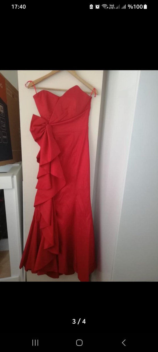 Kırmızı parlak kumaştan, drapeli ve straplez, uzun kesim klasik Paris tarzı abiye elbise. Düğünler için uygun, vücuda oturan model.