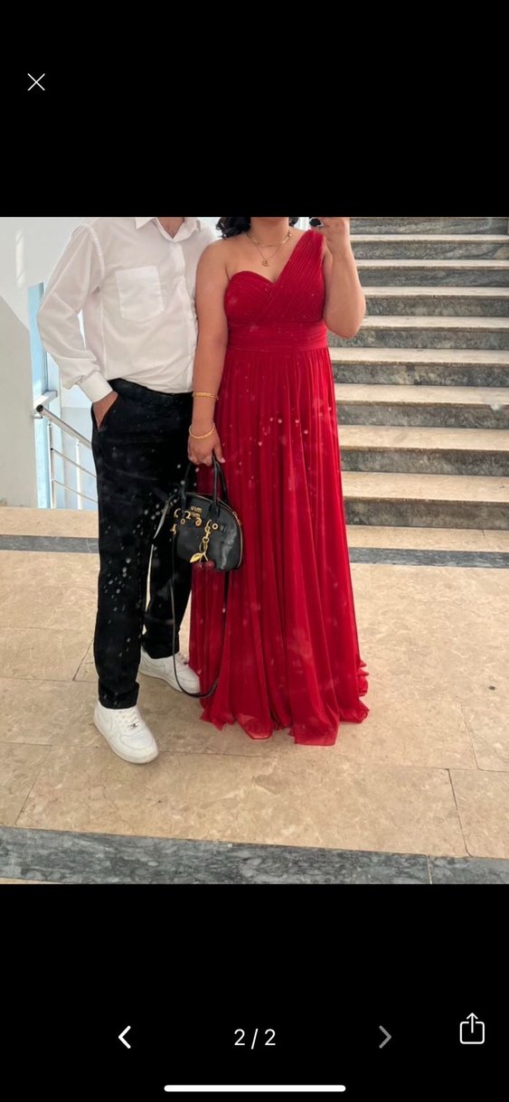 Klasik ve gösterişli tasarıma sahip, straplez yaka ve ince askılı, drapeli kırmızı uzun abiye elbise.