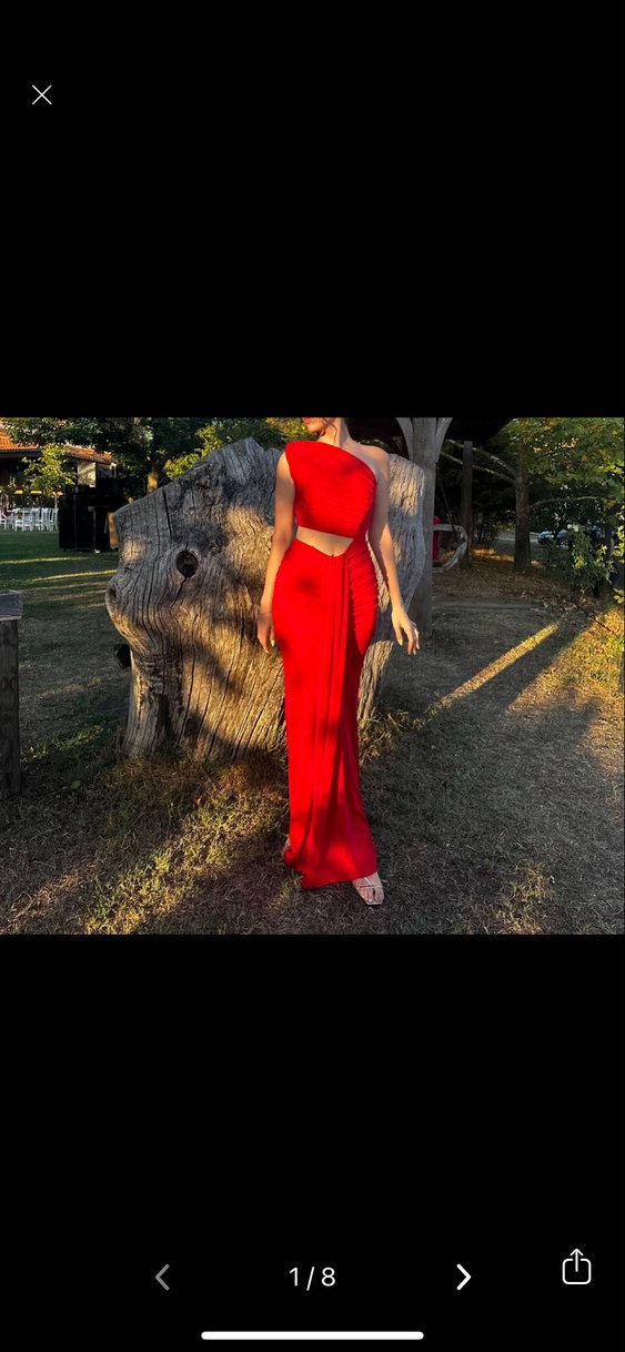 Parlak kırmızı, drapeli uzun elbise, straplez yaka ve vücuda oturan kesimle dikkat çeker. Kolsuz ve ipeksi dokusuyla parti için uygundur.