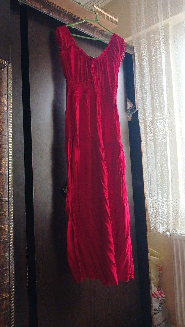 Kırmızı, straplez yakalı ve drapeli tasarıma sahip uzun, vücuda oturan elbise. İpeksi kumaştan, cesur bağlama boyası deseniyle romantik akşamlar için uygun.