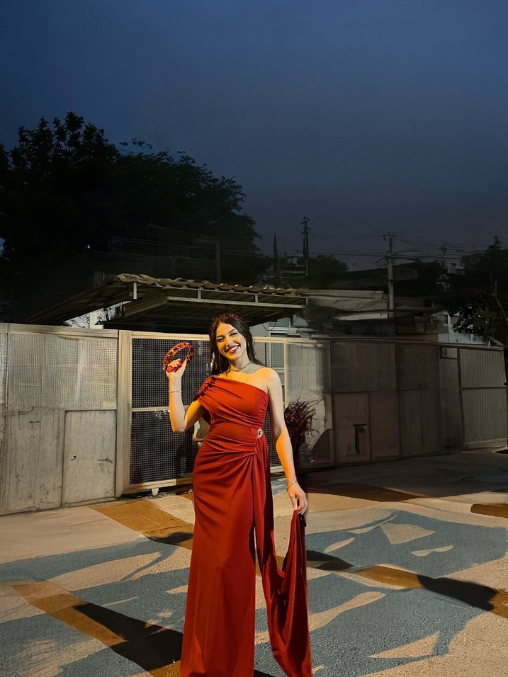 Uzun kırmızı abiye, drapeli tasarımı, straplez yaka tek omuz. Belindeki broş elbiseye ait değildir. Yalnızca 1 kez giyildi
