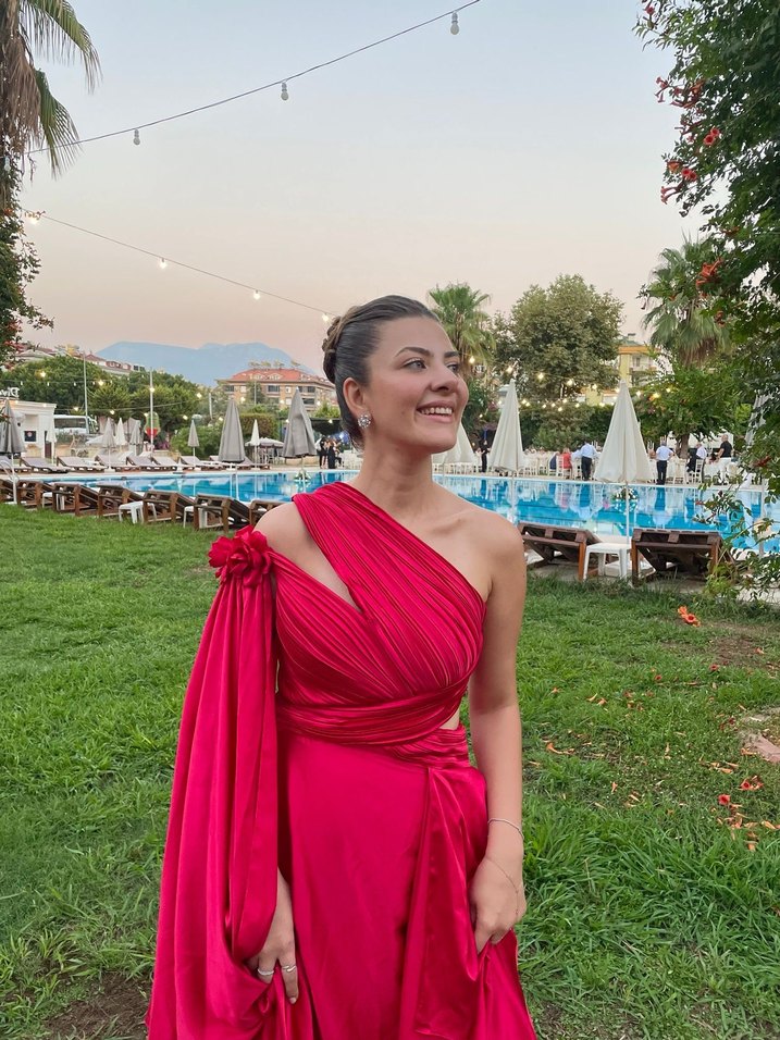 Kırmızı uzun, drapeli ve straplez yakalı, etnik desenli, bol kesim abiye. Parlak dokusuyla düğün ve özel günlere uygundur. ✨