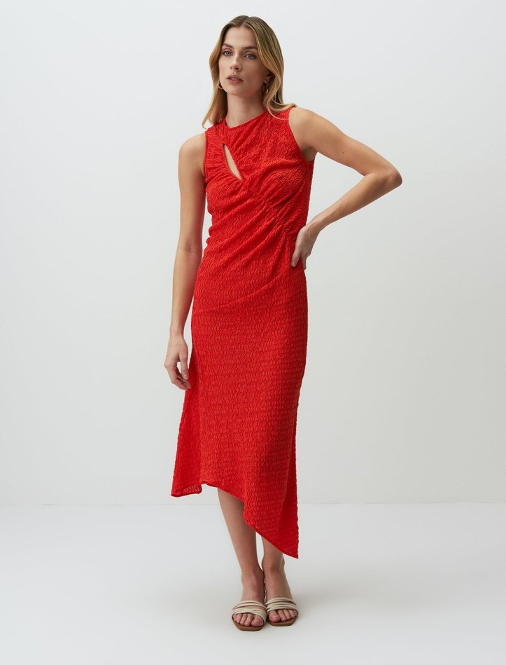 Kırmızı Drapeli Uzun V Yaka Elbise