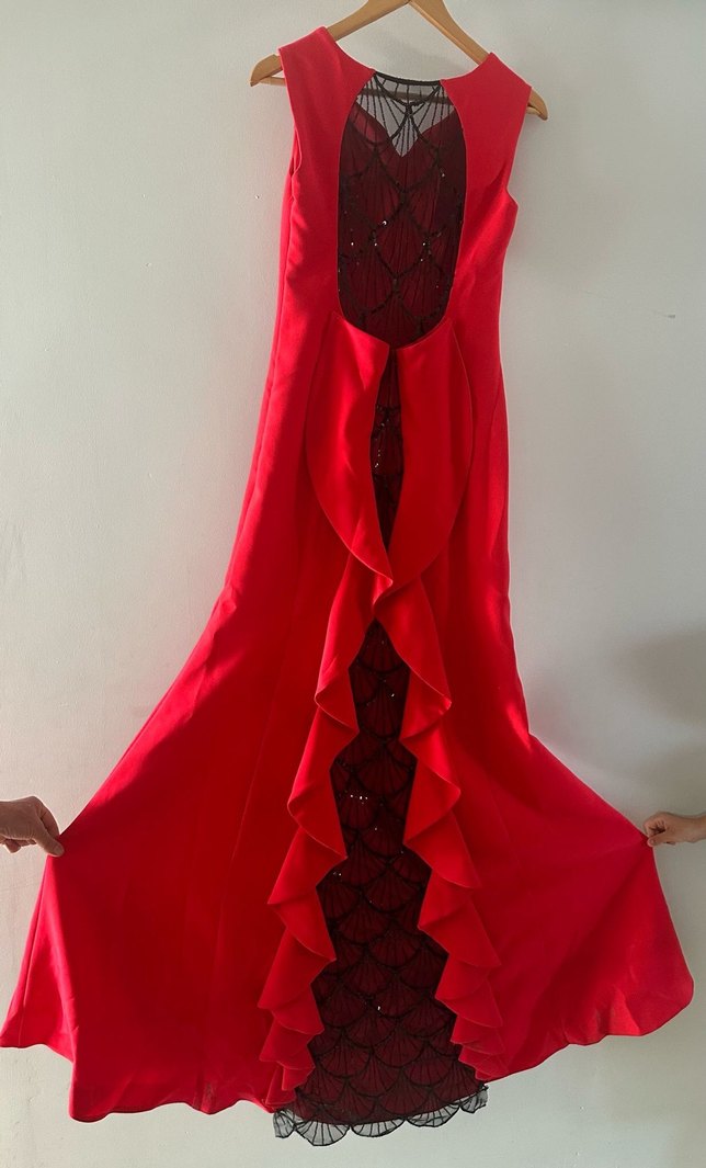 Kırmızı parlak kumaş, siyah desenli panelli, drapeli, uzun ve V yakalı, kolsuz, dar kesim kadın elbisesi. Avant-garde goth tarzında, düğün için uygun.
