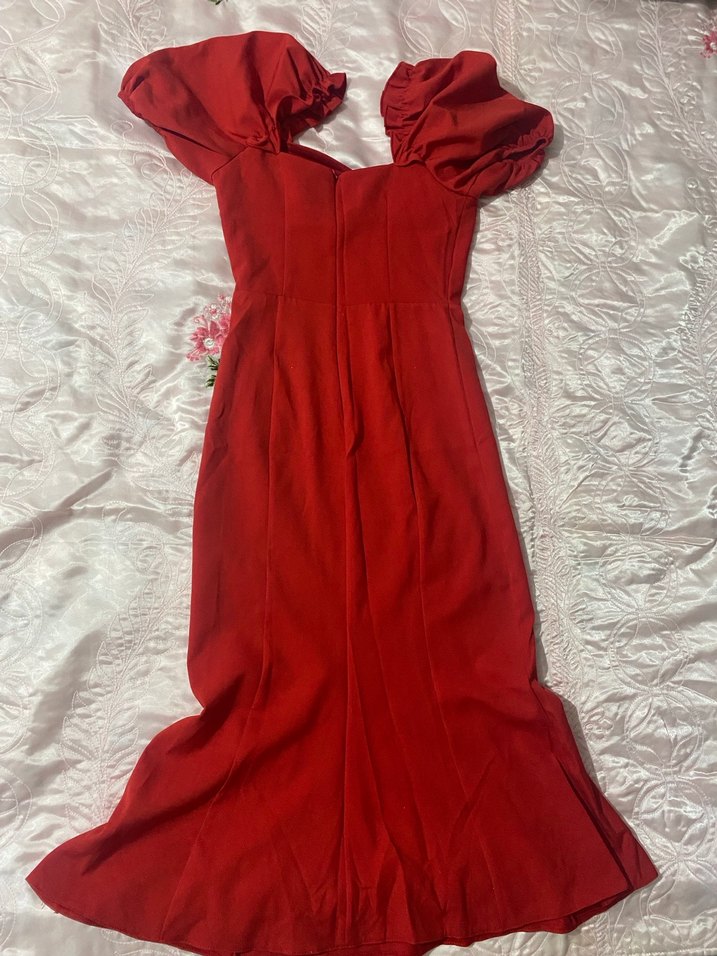 Parlak kırmızı uzun elbise, drapeli ve oturan kesimiyle dikkat çeker. Kısa kabarık kollu, V yakalı ve vintage bohem tarzda, düğünler için uygun.