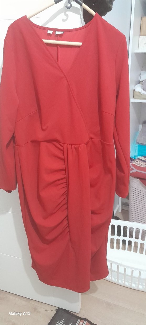 Kırmızı renkli, drapeli tasarıma sahip elbisesi. V yakalı, uzun kollu ve midi boyda, vücuda oturan kesimiyle günlük kullanıma uygun.