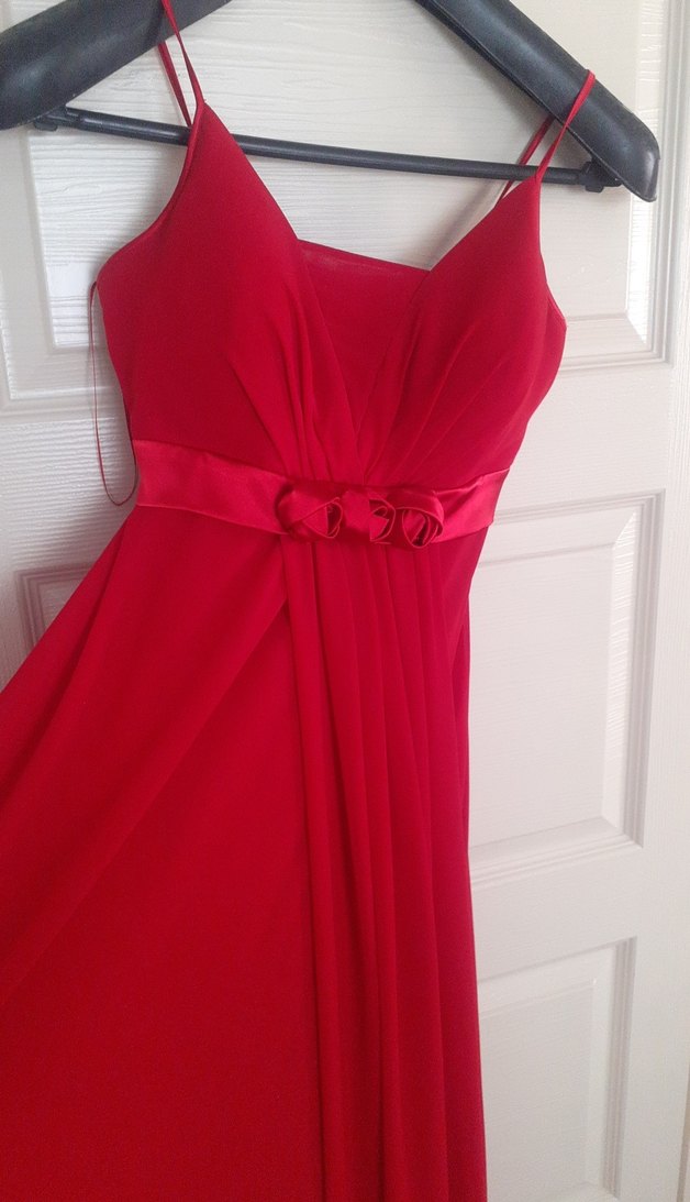 Kırmızı, drapeli ve parlak kumaştan yapılmış, ince askılı, V yakalı ve midi boyda klasik kesim abiye elbise. Düğün için uygundur.