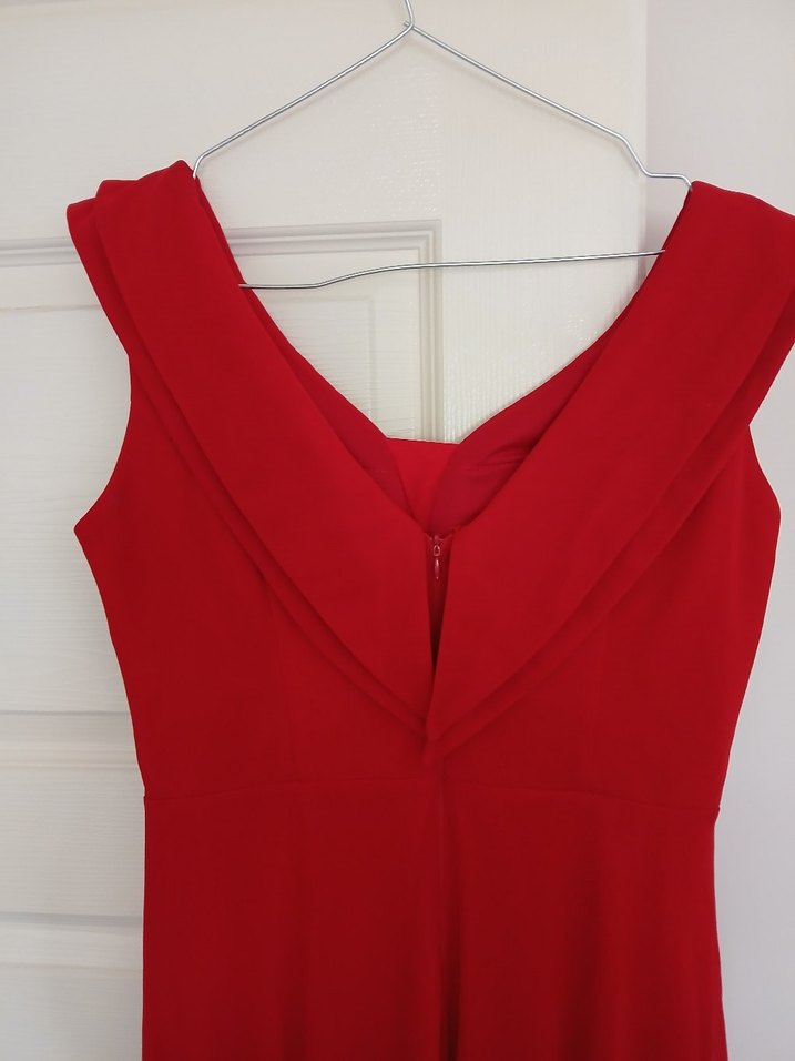 Parlak kırmızı kumaştan, drapeli V yaka ve kolsuz tasarıma sahip, ince kesim midi abiye elbise. Romantik buluşmalar için minimalist ve çağdaş bir tarz sunar.