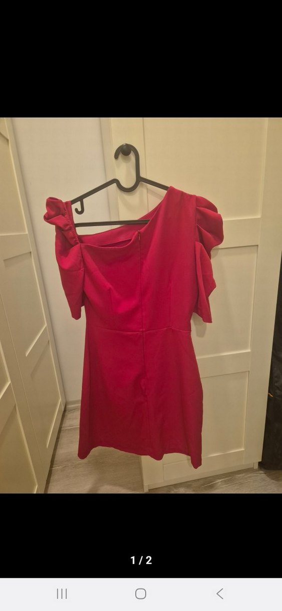 Kırmızı, drapeli kısa kollu, V yakalı, vücuda oturan midi elbise, romantik akşamlar için parlak ve minimalist tarz sunar.