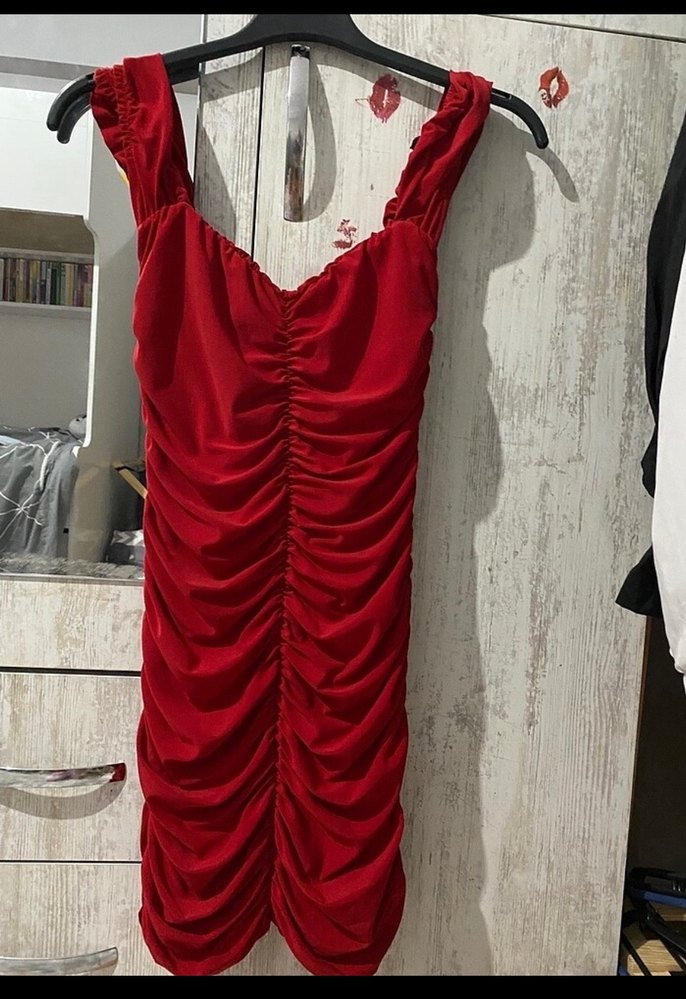 Kırmızı Drapeli V Yaka Midi Kadın Elbise