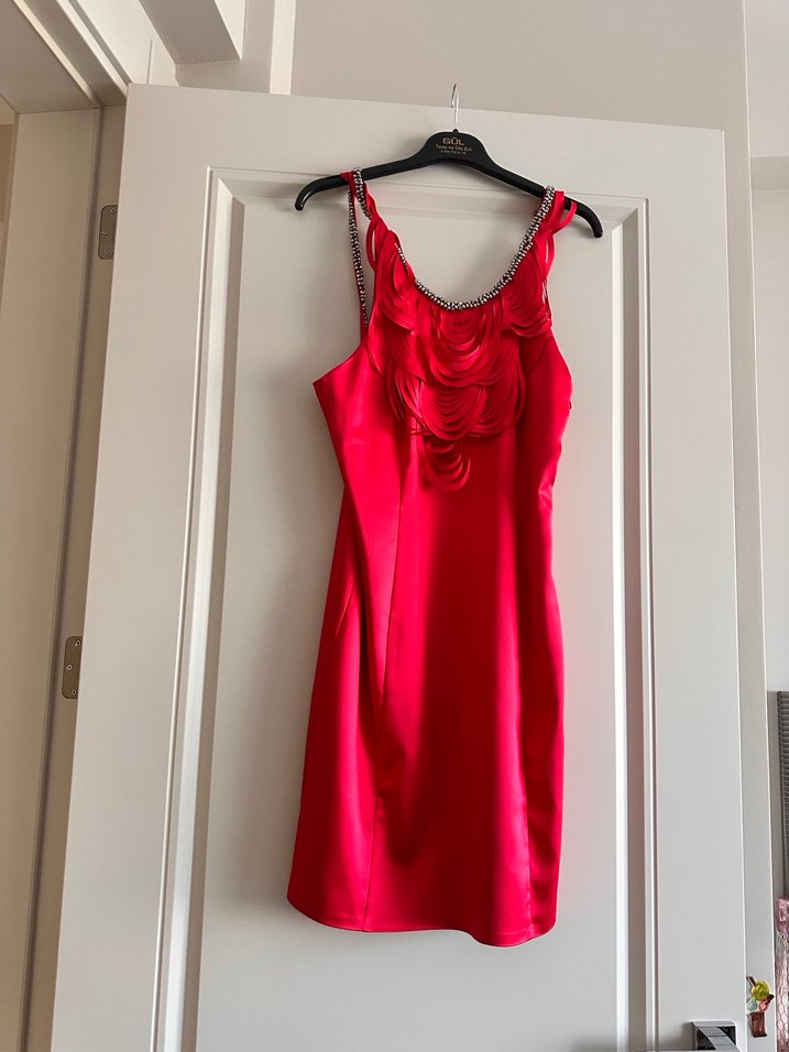 Kırmızı Drapeli V Yaka Mini Abiye Elbise