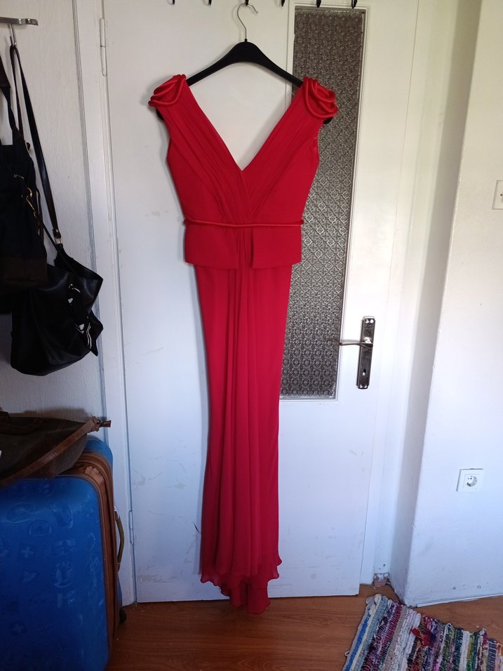 Drapeli tasarımı ve derin V yakasıyla fitted uzun abiye elbise. Parlak kırmızı kumaşıyla modern klasik tarzda, düğünler için uygundur. Sadece bir kere giyildi. İyi ve temiz durumda.