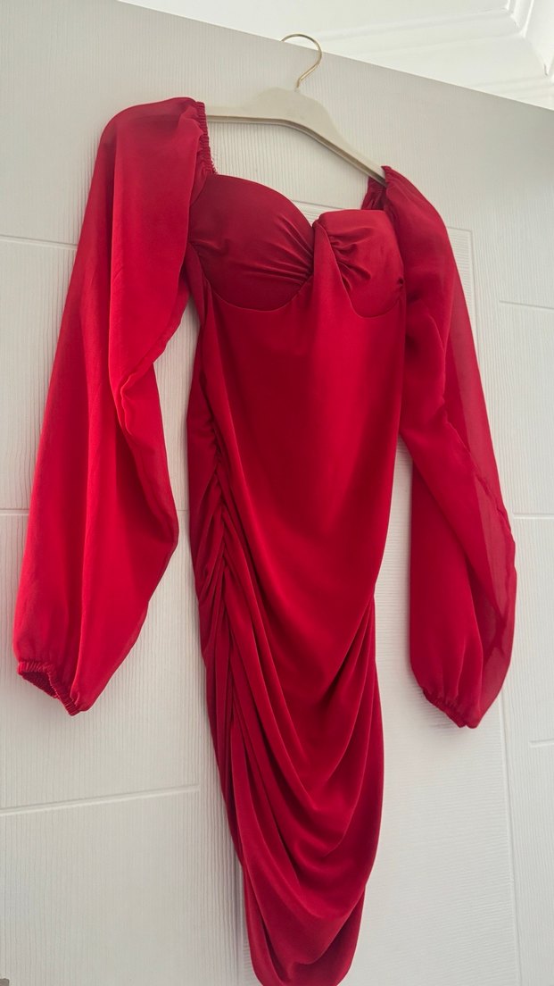 Bu kırmızı uzun abiye elbise, drapeli tasarımı, V yakası ve uzun kollarıyla gösterişli romantik akşamlar için uygundur.