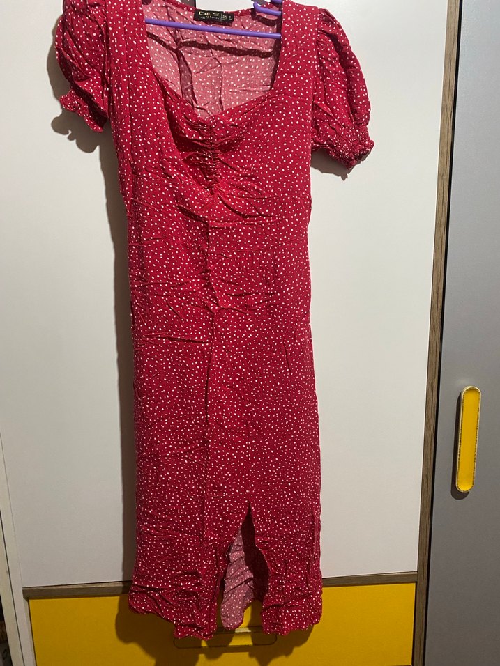 Kısa kollu, drapeli ön detaylı ve V yakalı, fitted kesim uzun elbise. Yumuşak sentetik kumaştan, koyu kırmızı tie-dye desenli, bohem ve retro tarzı yansıtır.