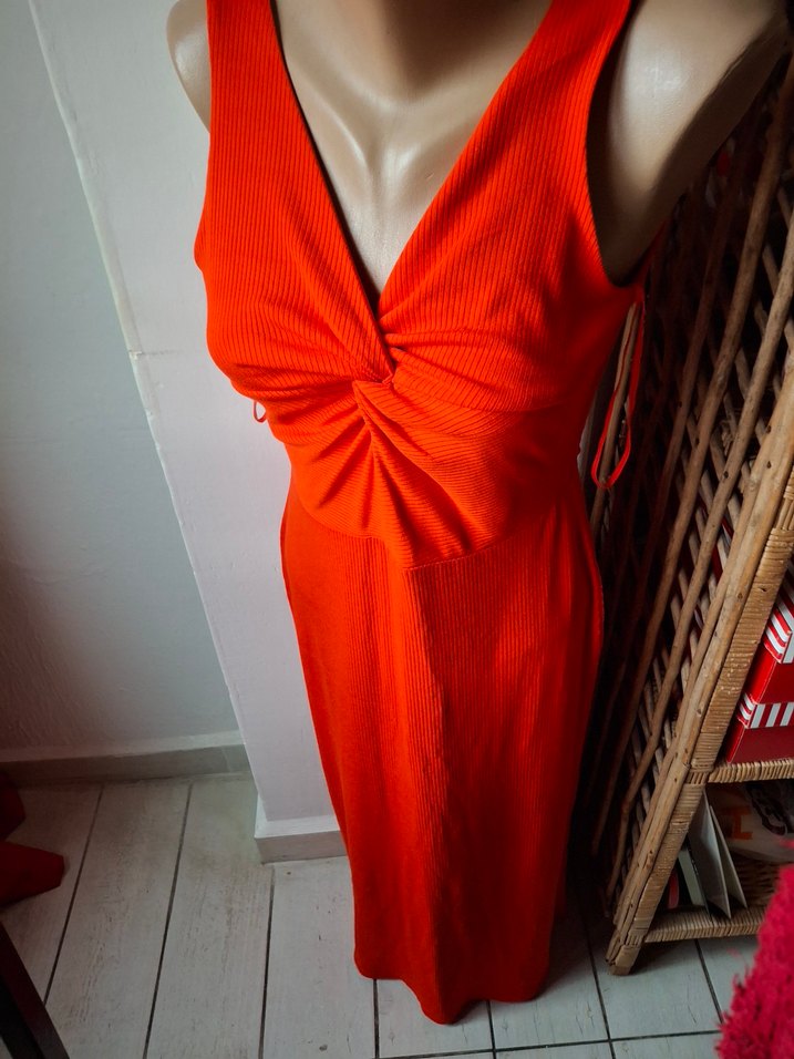 Kırmızı, drapeli ve V yakalı, uzun boy, dar kesim kadın gece elbisesi. S beden.