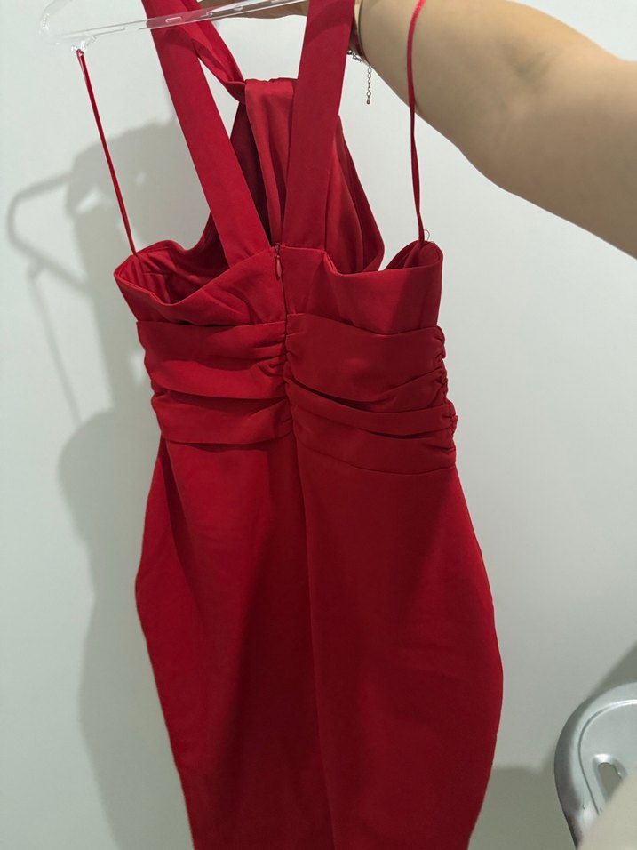 Kırmızı Drapeli V Yakalı Midi Elbise