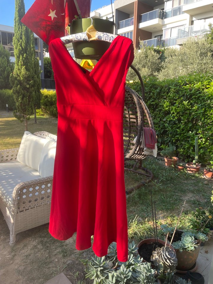 Kırmızı, drapeli V yakalı, kolsuz ve fitted kesim midi elbise. Parlak kumaşı ve vintage bohem tarzıyla dış mekan etkinlikleri için ideal.
