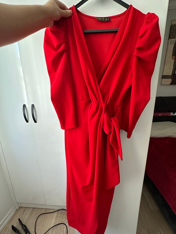 Kırmızı Drapeli V Yakalı Midi Elbise