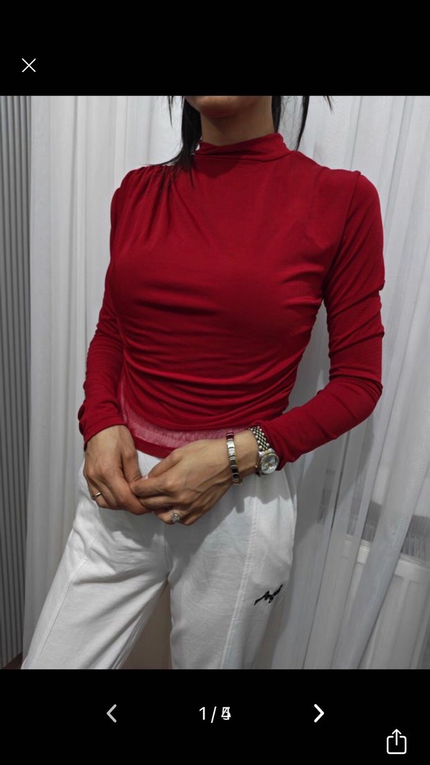 Yüksek yakalı ve uzun kollu, drapeli tasarıma sahip kırmızı renkli, vücuda oturan kısa kesim bluz. Yumuşak sentetik kumaştan üretilmiştir, günlük ve sokak stiline uygundur.