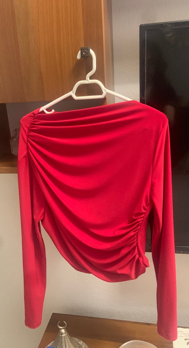 Kırmızı, uzun kollu, yüksek yakalı ve drapeli detaylı, parlak sentetik kumaştan yapılmış kadın bluz. Minimalist ve çağdaş tarzda, romantik akşamlar için uygun. ❤️