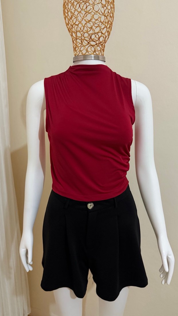 Kırmızı drapeli, yüksek yakalı, kolsuz ve mini boyda, dar kesim bir atlet. Yumuşak sentetik kumaştan üretilmiştir, günlük sokak stili için uygundur.