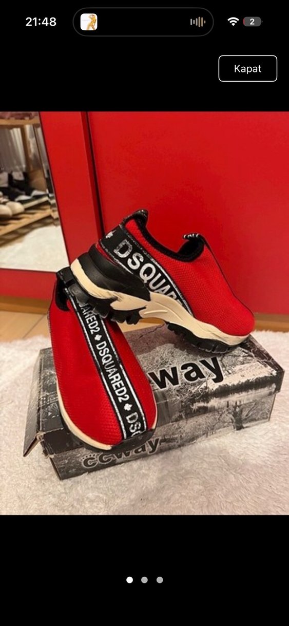 Kırmızı DSQUARED2 sneakers, renkli baskılı desen, velcro kapanış ve kauçuk tabanlı, günlük sokak stili için uygun.