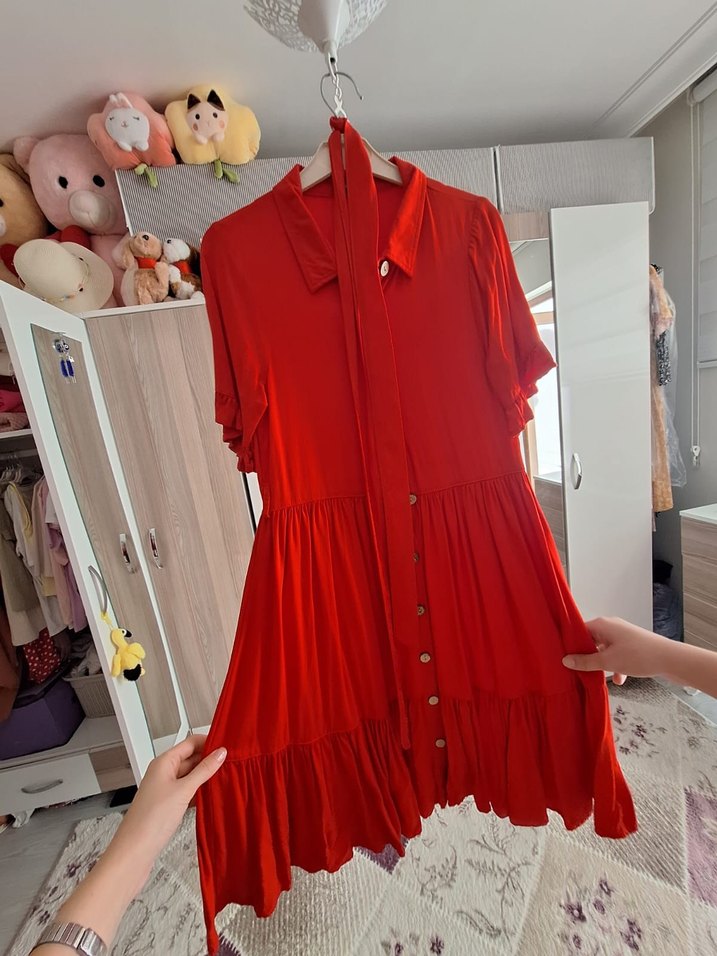 Kırmızı midi boy, düğmeli, kısa kollu, bol kesim bohem elbise. Parlak sentetik kumaştan, halter yaka ve desen içermeyen tasarım.