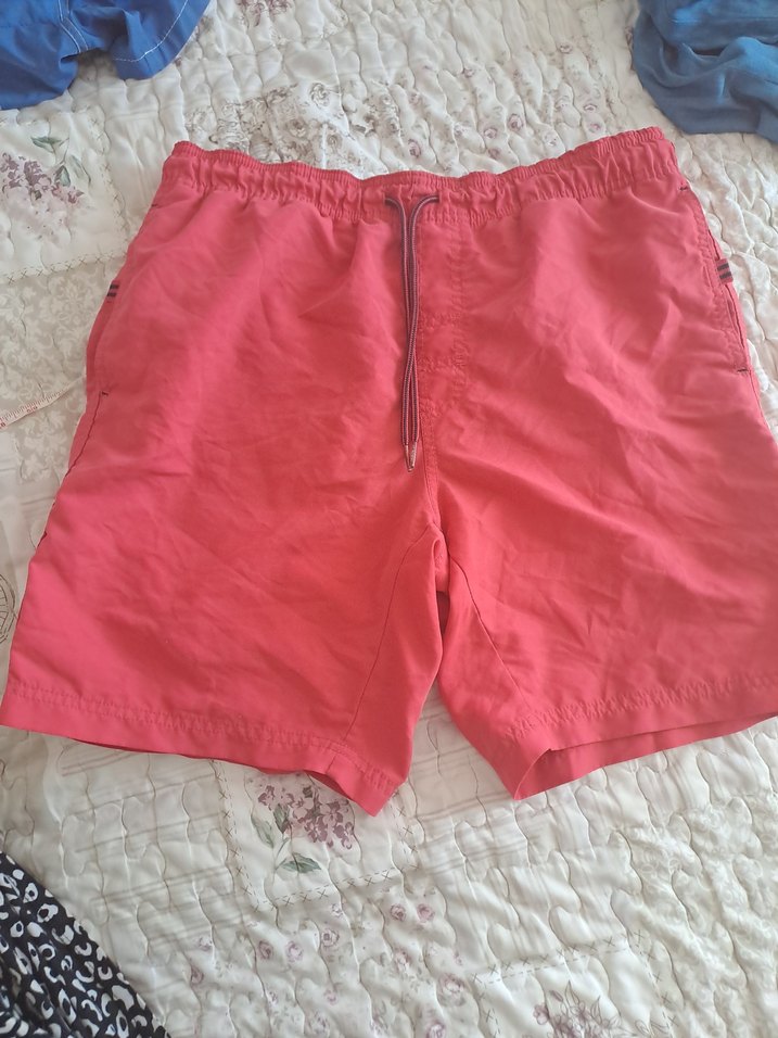 Canlı kırmızı renkte, düğmeli detaylı, bol kesim erkek mini şort. Plaj ve sokak stiline uygundur.