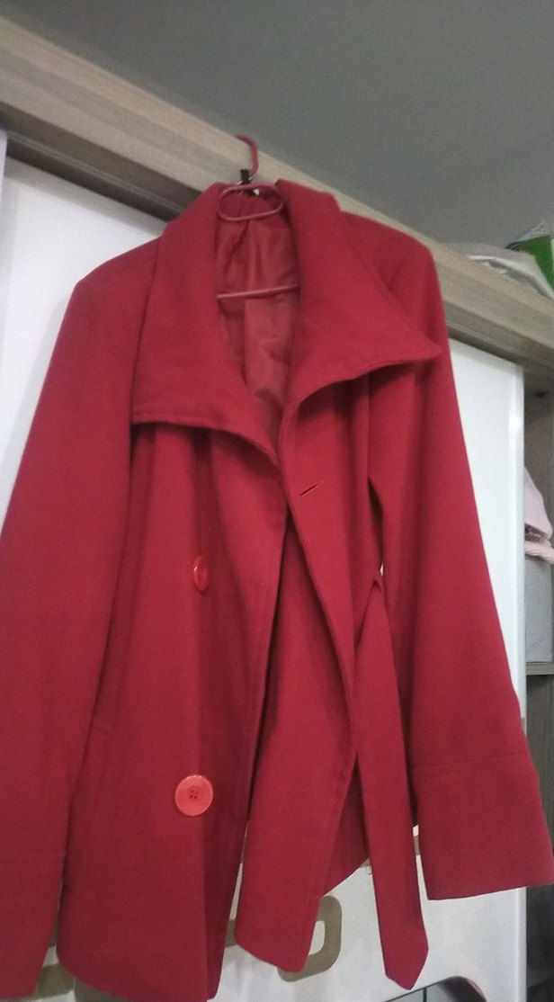 Geniş yakalı, büyük düğmeli kırmızı kaşe kaban. Yumuşak ve sıcak kumaştan, yan ceplidir.