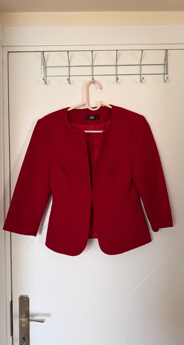Düğmeli kırmızı kadın blazer, yaka detaylı ve uzun kolludur. Parlak görünümlü, sentetik kumaştan, ofis için uygundur.