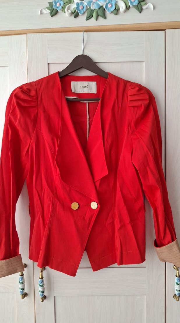 Kadınlar için parlak kırmızı, düğmeli, ipeksi kumaştan, modern klasik tarzda, normal uzunlukta ve regular fit kesime sahip blazer ceket. Ofis için uygundur. ✨
