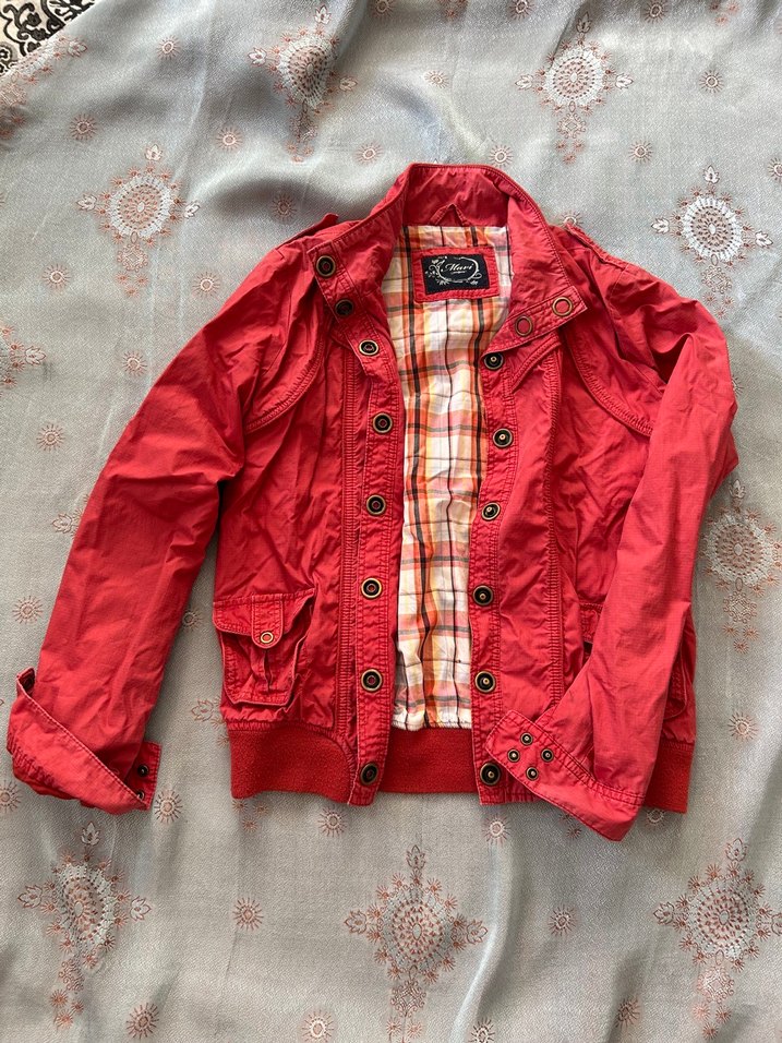 Vintage kırmızı kadın ceketi, düğmeli, uzun kollu ve kesik yaka detaylıdır. Normal midi boyda, bol kesim ve yumuşak tekstil kumaştandır. #vintage