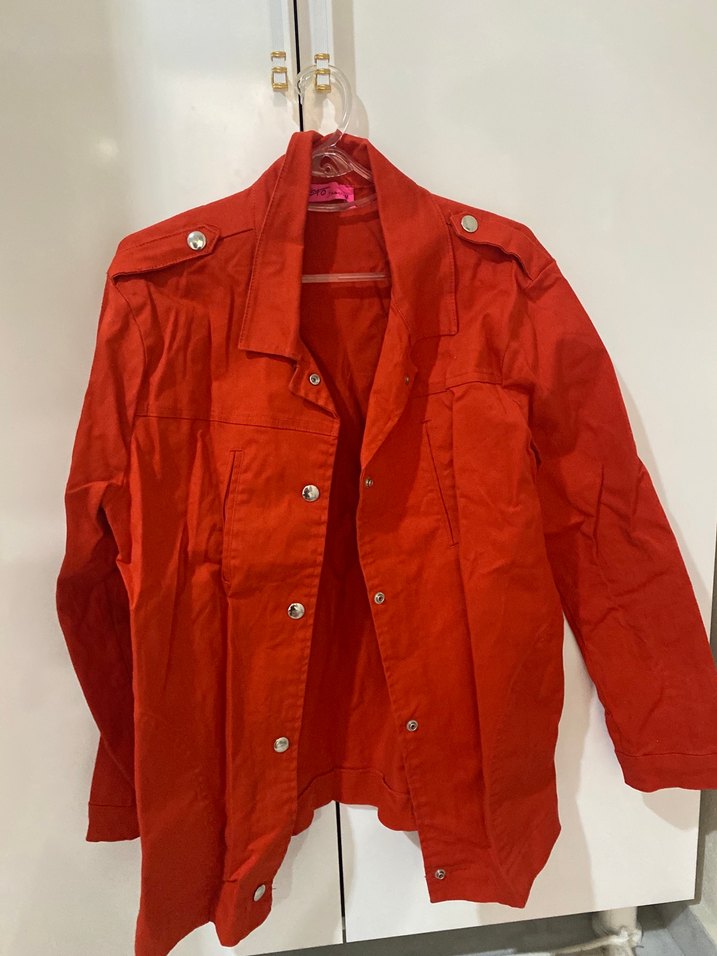 Parlak kırmızı renkte, düğmeli, keten kumaştan kadın ceket. Uzun kollu, normal boyda ve salaş kesim. Günlük rahat sokak stili için uygundur.