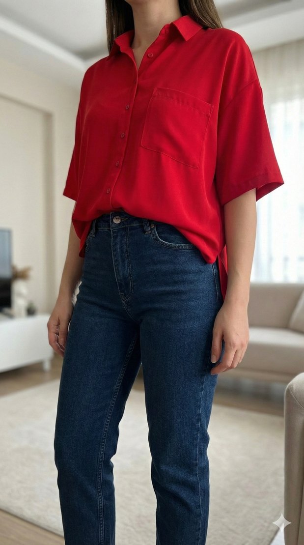 Kısa kollu, yakalı ve düğmeli kırmızı kadın gömleği. İpeksi kumaştan, bol kesim ve parlak renkte, günlük kullanıma uygun.