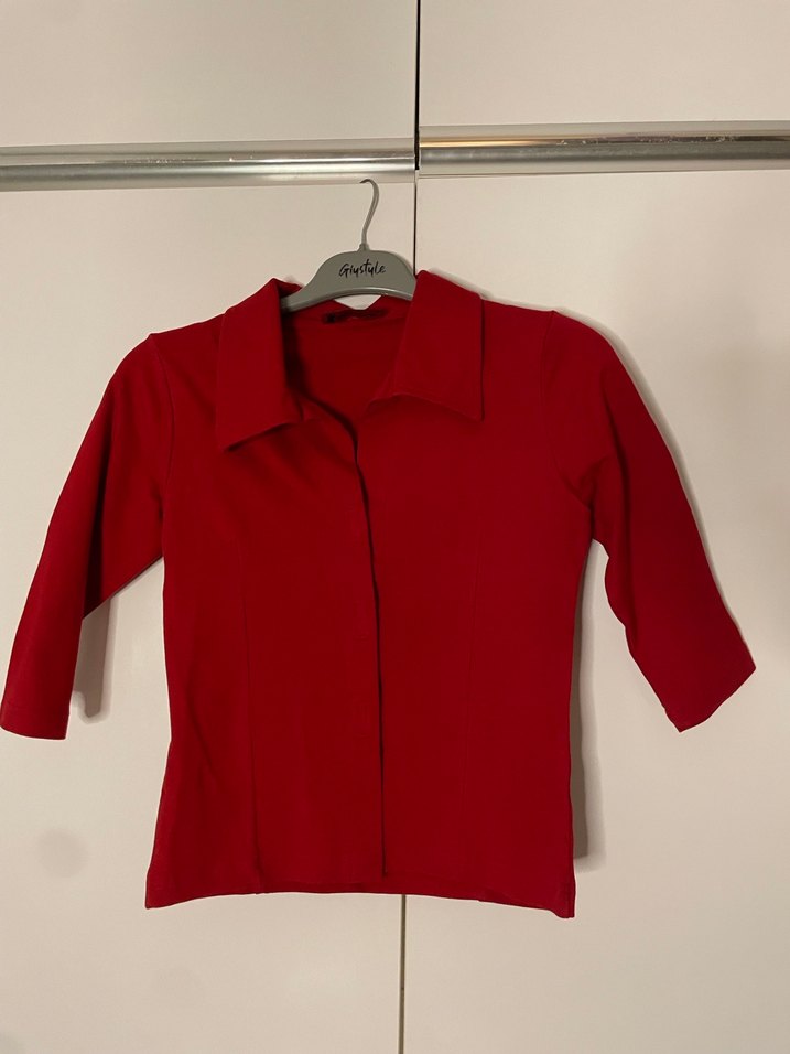 Düğmeli, yakalı ve kısa kollu, kırmızı renkli kadın gömleği. Sentetik kumaştan, normal midi boyunda ve ofis için uygun, minimalist ve sade tarzda.