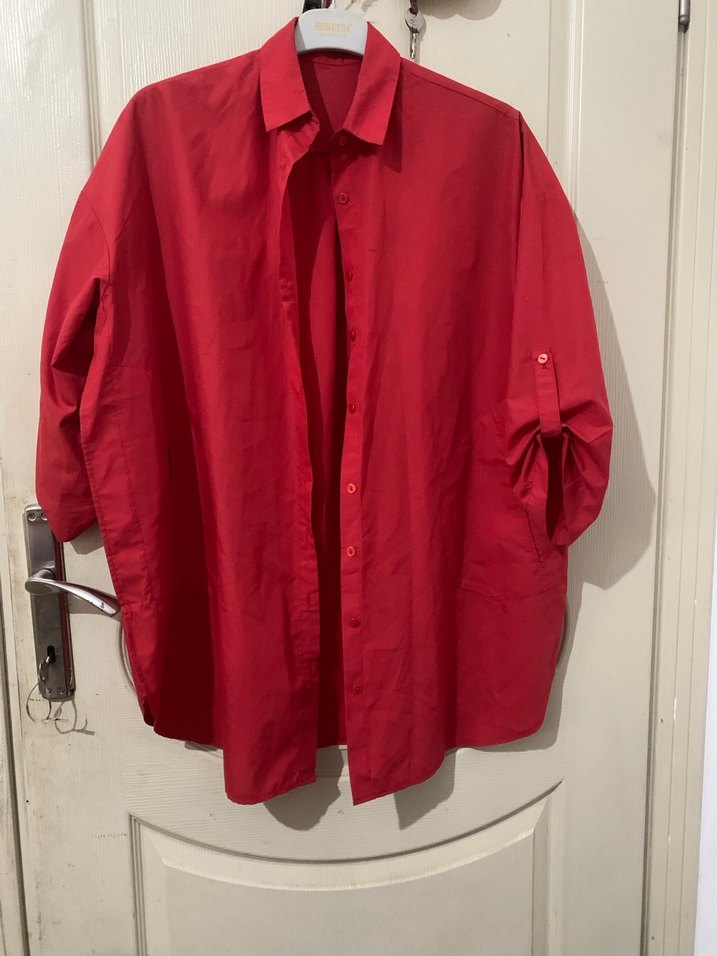 Uzun kollu, düğmeli, yakalı kırmızı keten gömlek. Salaş kesimi ve parlak kumaşıyla günlük kullanıma uygun.