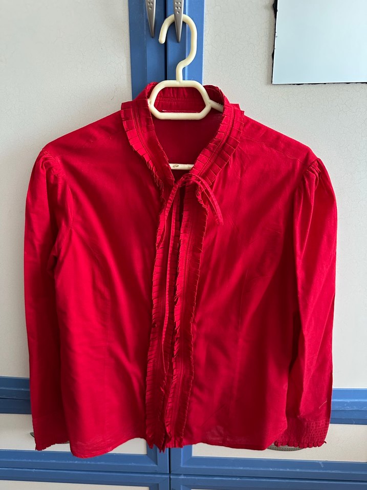 Düğmeli, yakalı ve uzun kollu, kırmızı vücuda oturan kadın gömleği. Beden xl yazıyor ama kalıbı dar tahmini 38 /40 beden olur.